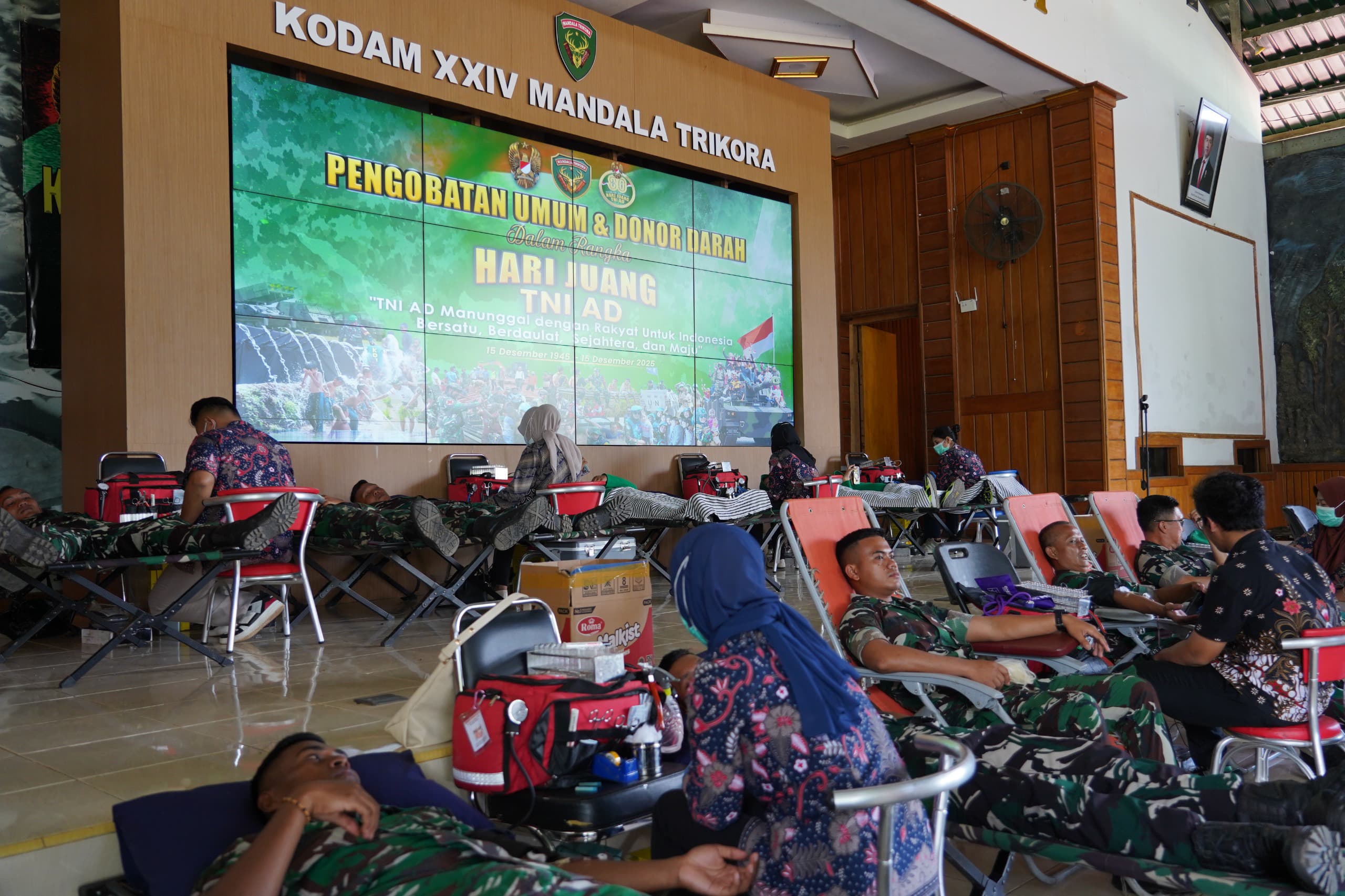 Merauke||Cendrawasi7, Kodam XXIV/Mandala Trikora menggelar aksi kemanusiaan berupa donor darah dan pengobatan umum menjelang puncak Hari Juang Kartika (HJK) 2025, Rabu (10/12/2025). Bertempat di Aula L.B. Moerdani Makodam XXIV/MT, kegiatan ini menjadi penegasan komitmen TNI AD dalam memberikan manfaat nyata bagi masyarakat Papua Selatan.