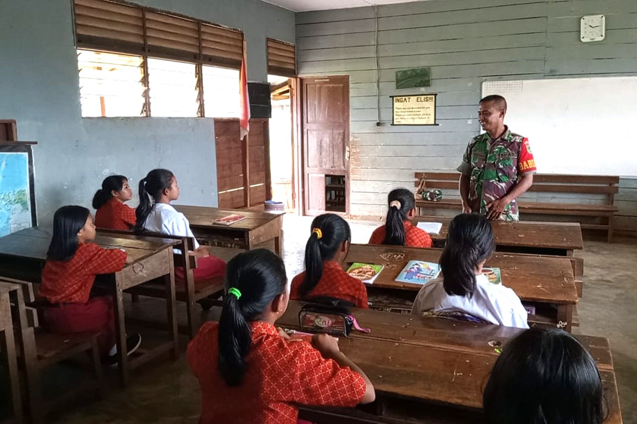 Dalam rangka membantu meningkatkan kecerdasan para siswa-siswi, Babinsa Koramil 1707-15/Ulilin jajaran Kodim 1707/Merauke Serda Purnomo membantu para guru dalam mengajar kepada siswa-siswi Sekolah Dasar Inpres Rawahayu Kampung Rawahayu Distrik Ulilin Kabupaten Merauke Provinsi Papua Selatan. Kamis (5/1/2023).