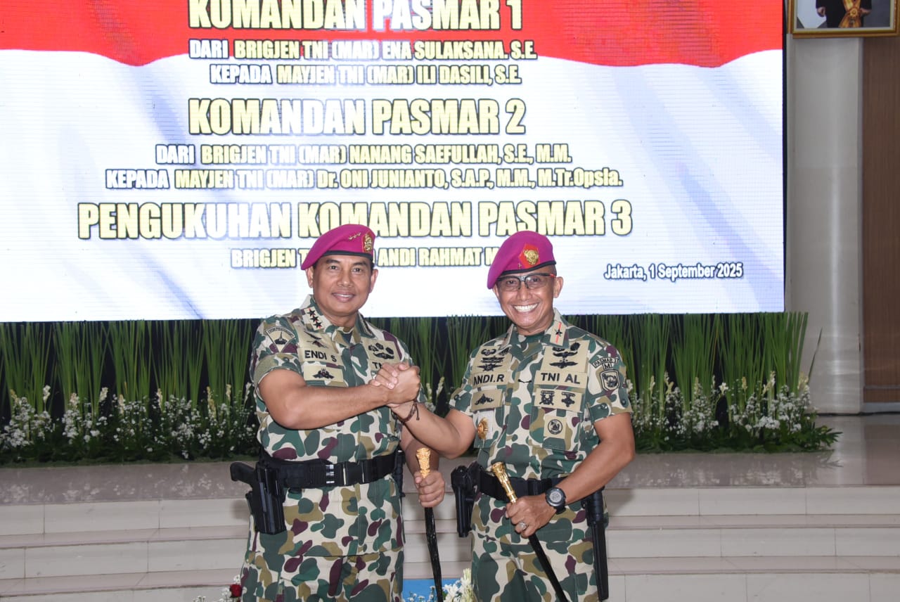 SORONG||cendrawasi7, TNI AL, Dispen Kormar. Komandan Pasmar 3, Brigjen TNI (Mar) Andi Rahmat M., resmi dikukuhkan dalam jabatan tetap sebagai Komandan Pasmar 3 melalui upacara Serah Terima Jabatan (Sertijab) dan Pengukuhan yang dipimpin langsung oleh Panglima Korps Marinir (Pangkormar) Letjen TNI (Mar) Dr. Endi Supardi, S.E., M.M., M.Tr.Opsla., CHRMP., CRMP., bertempat di Gedung Putih Mako Kormar, No.40 Kwitang, Jakarta Pusat. Senin (01/09/2025).