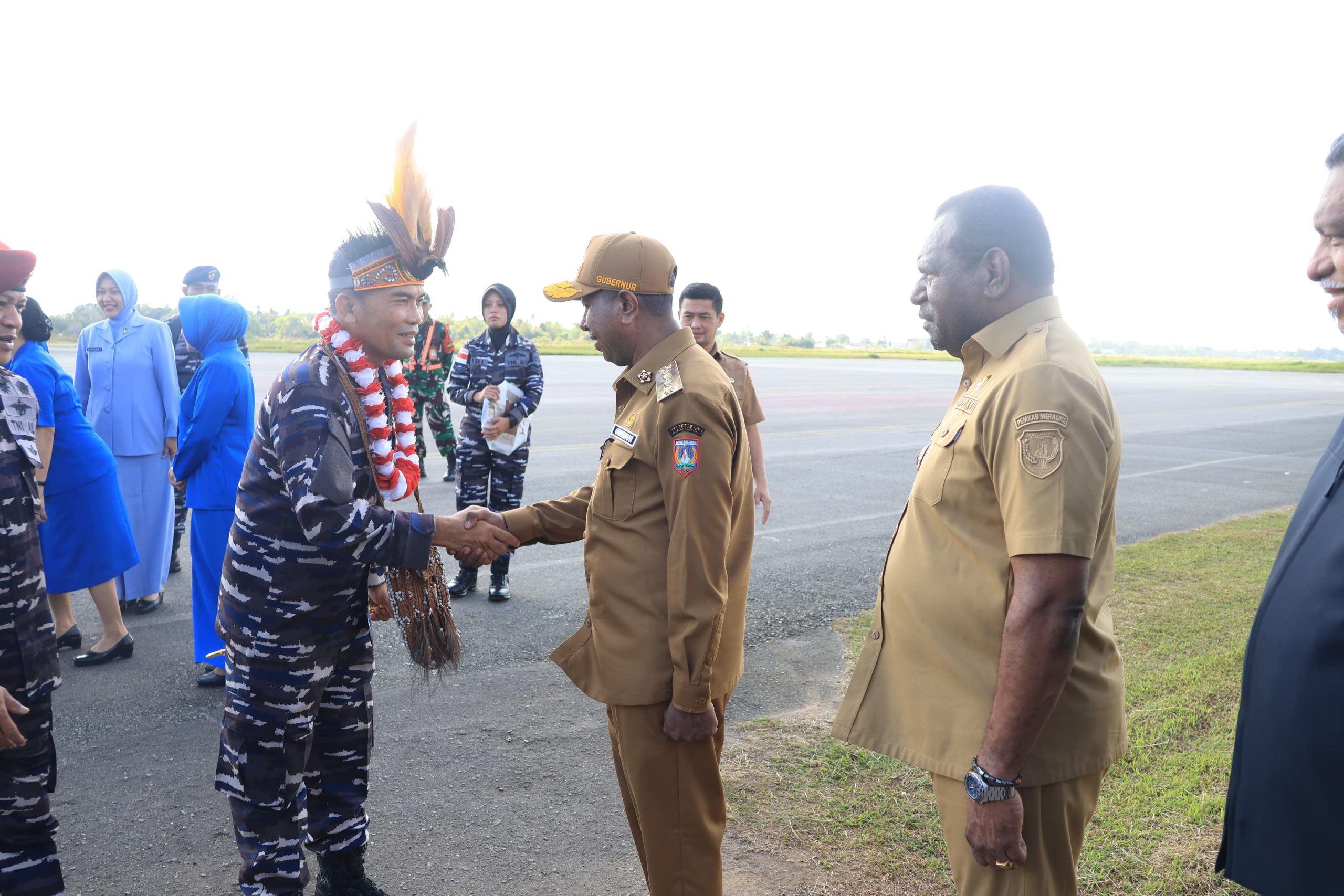 Penyambutan berlangsung di depan ruang VIP Bandara Mopah. Selain Gubernur dan Bupati, jajaran Forum Koordinasi Pimpinan Daerah (Forkopimda) Papua Selatan dan Kabupaten Merauke juga hadir dalam prosesi penyambutan tersebut.