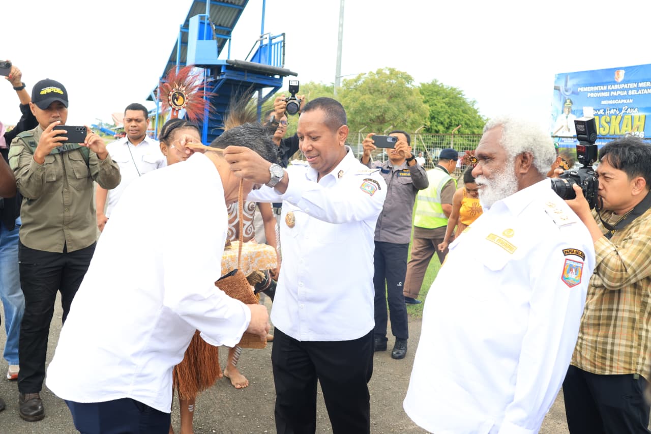 Penyambutan berlangsung khidmat di depan pintu masuk ruang VIP bandara. Setibanya di lokasi, Wamendes disambut dengan prosesi adat khas Papua Selatan. Gubernur Apolo secara simbolis memakaikan mahkota kepala tradisional dan mengalungkan noken ke leher Ahmad Riza Patria sebagai bentuk penghormatan.