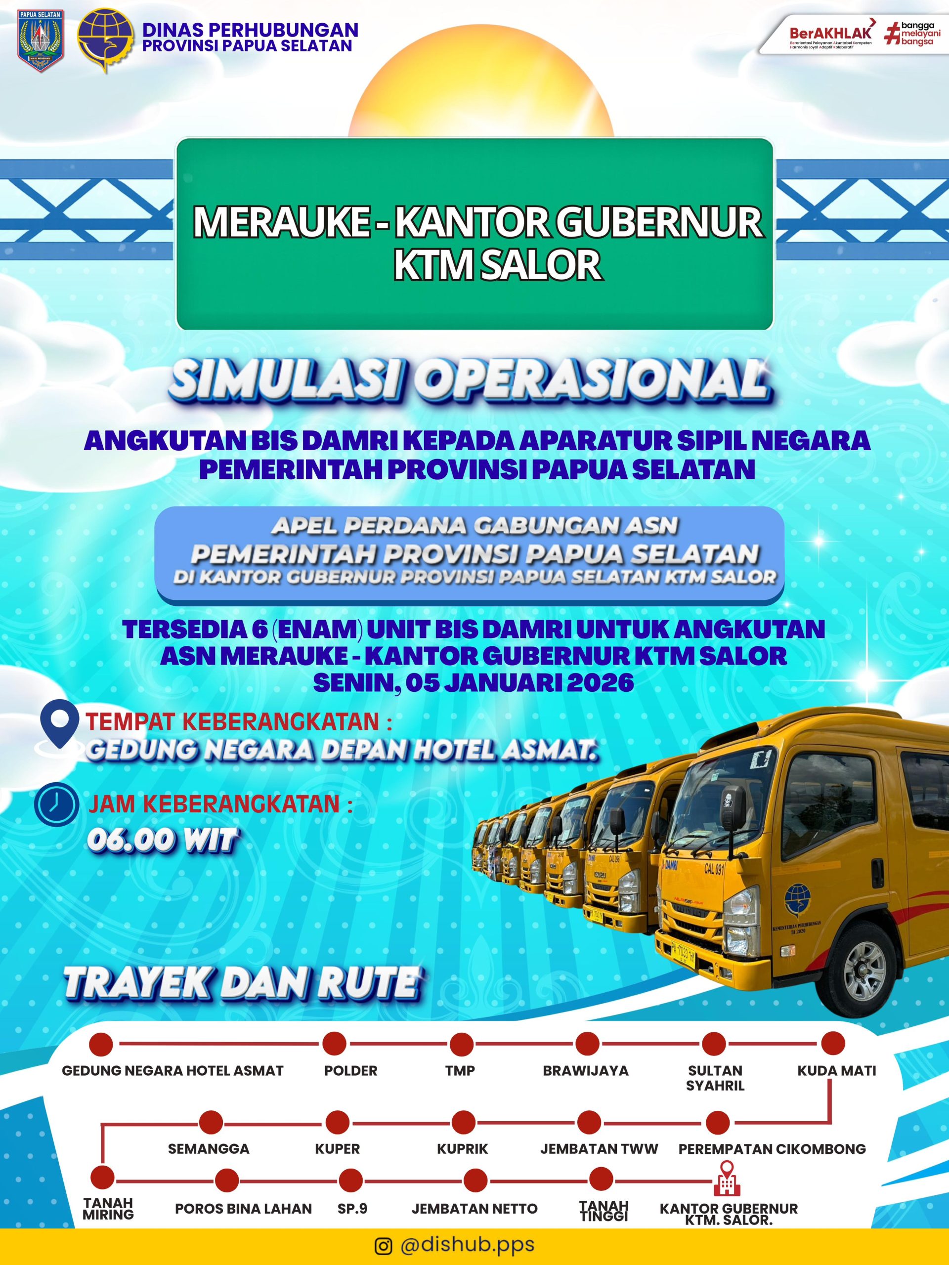 Simulasi angkutan tersebut dijadwalkan berlangsung pada Senin (5/1/2026), bersamaan dengan pelaksanaan Apel Perdana Gabungan ASN. Dalam kegiatan ini, Dishub Papua Selatan menyiapkan layanan angkutan bus bagi ASN yang mengikuti apel tersebut.