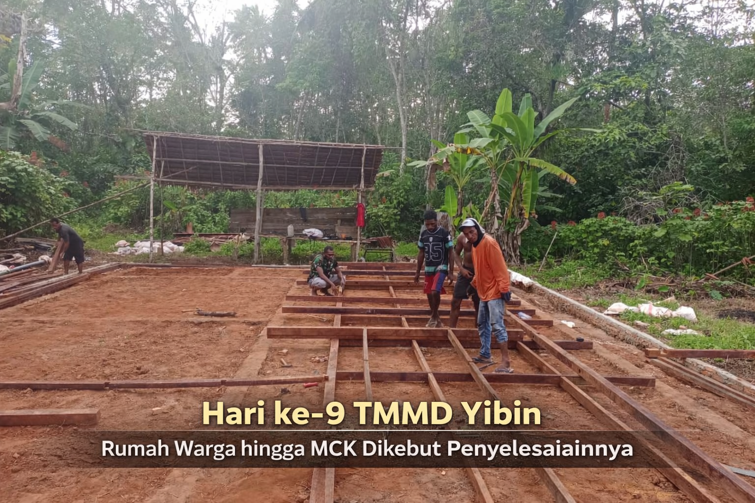 Pada pelaksanaan hari ke-9, fokus pekerjaan diarahkan pada sejumlah sasaran fisik. Di antaranya pembangunan rangka rumah warga, penyetelan struktur bangunan, pengecoran septic tank, hingga plester dinding MCK di belakang Gereja St. Paulus Yibin. Selain itu, personel juga melakukan pembongkaran material dari kapal kayu ke dermaga serta pengangkutan bahan bangunan menuju titik pengerjaan.