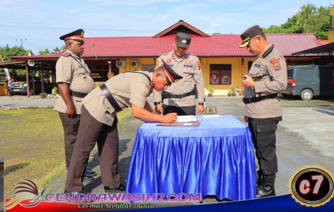 Rangkaian kegiatan diawali dengan pembacaan Surat Keputusan Kapolda Papua Nomor: KEP/523/VII/2025, dilanjutkan dengan Penyematan Tanda Jabatan oleh Kapolres Waropen, Pengambilan Sumpah Jabatan, serta Penandatanganan Berita Acara dan Pakta Integritas.