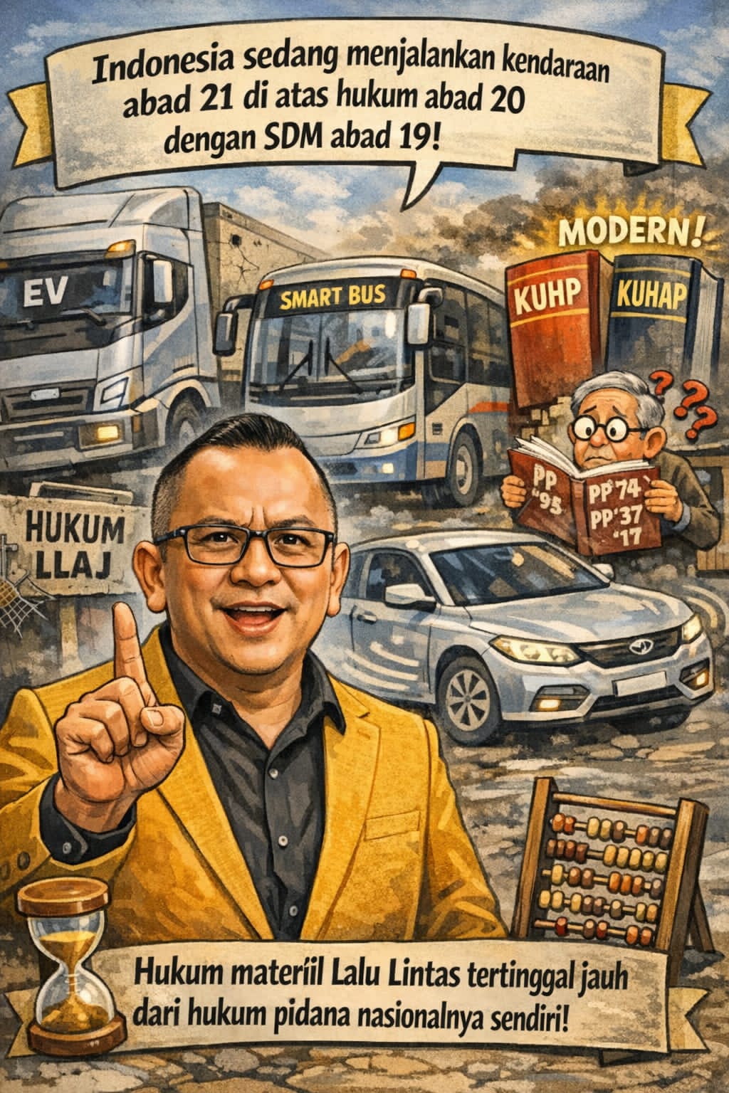 Jakarta ||Perkembangan teknologi kendaraan bermotor telah melaju jauh memasuki era kendaraan listrik, sistem bantuan mengemudi (ADAS), digitalisasi kendaraan, hingga menuju kendaraan otonom dan angkutan berbasis aplikasi. Namun, kemajuan tersebut tidak diiringi dengan pembaruan kerangka hukum lalu lintas dan angkutan jalan di Indonesia yang hingga hari ini masih bertumpu pada Undang Undang Nomor 22 Tahun 2009 beserta peraturan turunannya yang lahir dari paradigma teknologi konvensional. Pada saat yang sama, kualitas dan kompetensi sumber daya manusia baik pengemudi, penguji kendaraan, aparat penegak hukum, maupun regulator belum mengalami lompatan kapasitas yang memadai (up-skilling). Artikel ini berangkat dari tesis bahwa Indonesia sedang mengoperasikan kendaraan abad ke-21 di atas hukum abad ke-20 dengan sumber daya manusia abad ke-19. Ketimpangan ini bukan hanya melahirkan ketidak adilan dalam penanganan kecelakaan lalu lintas, tetapi juga menempatkan negara dalam posisi lalai secara sistemik terhadap kewajiban melindungi keselamatan warganya. Artikel ini mengusulkan reformasi total hukum lalu lintas yang berbasis pendekatan sistem, modernisasi regulasi, dan transformasi sumber daya manusia sebagai satu kesatuan agenda peradaban hukum.