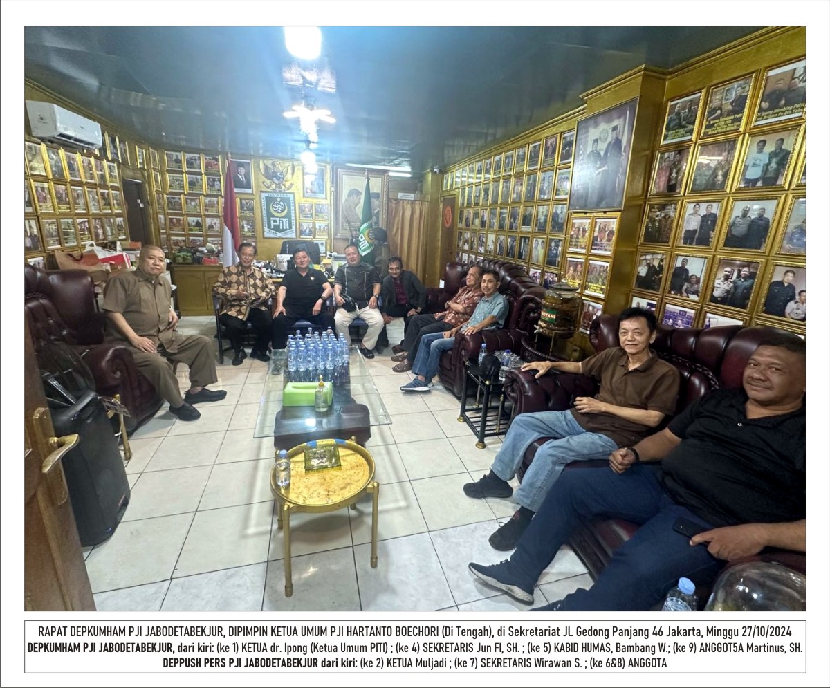 Ketua Umum Persatuan Jurnalis Indonesia (PJI), Hartanto Boechori, resmi menunjuk dr. Ipong Wijaya Kusuma sebagai Ketua Depkumham PJI Jabodetabekjur (Jakarta, Bogor, Depok, Tangerang, Bekasi, Cianjur) melalui Surat Mandat No. 070/SPNJ/DPP PJI/X/2024. Dalam Mandatnya, Boechori menunjuk The Hembing Center jalan Gedong Panjang 46 Jakarta sebagai sekretariat Depkumham PJI Jabodetabekjur.