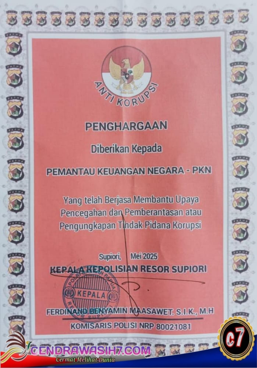 Bekasi||cendrawasi7, 02 September 2025 Pemantau Keuangan negara PKN kembali menerima Piagam Penghargaan dari negara Melalui Kapolri CQ Kapolres Supiori Papua demikian di sampaikan Patar Sihotang SH MH Ketua umum PKN pada saat Konprensi Pers di Kantor PKN Pusat Jl Caman raya No 7 Jatibening Bekasi dini hari senin tanggal 1 September 2025 .
