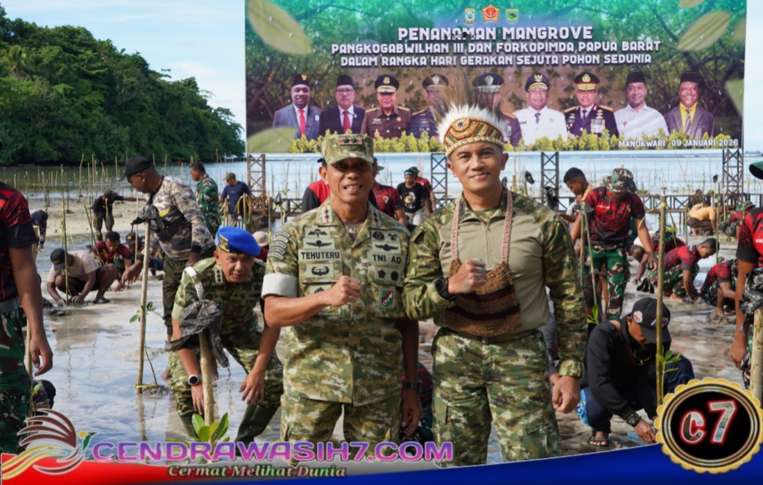 Manokwari Utara||Cendrawasi7.com, Dalam rangka memperingati Hari Gerakan Sejuta Pohon Sedunia, Pangkogabwilhan III Letjen TNI Bambang Trisnohadi, S.I.P., bersama Pangdam XVIII/Kasuari Mayjen TNI Christian Kurnianto Tehuteru serta unsur Forkopimda Papua Barat melaksanakan penanaman 1.500 pohon mangrove di Pantai Saubeba, Distrik Manokwari Utara, Papua Barat, Jumat (09/01/2026).