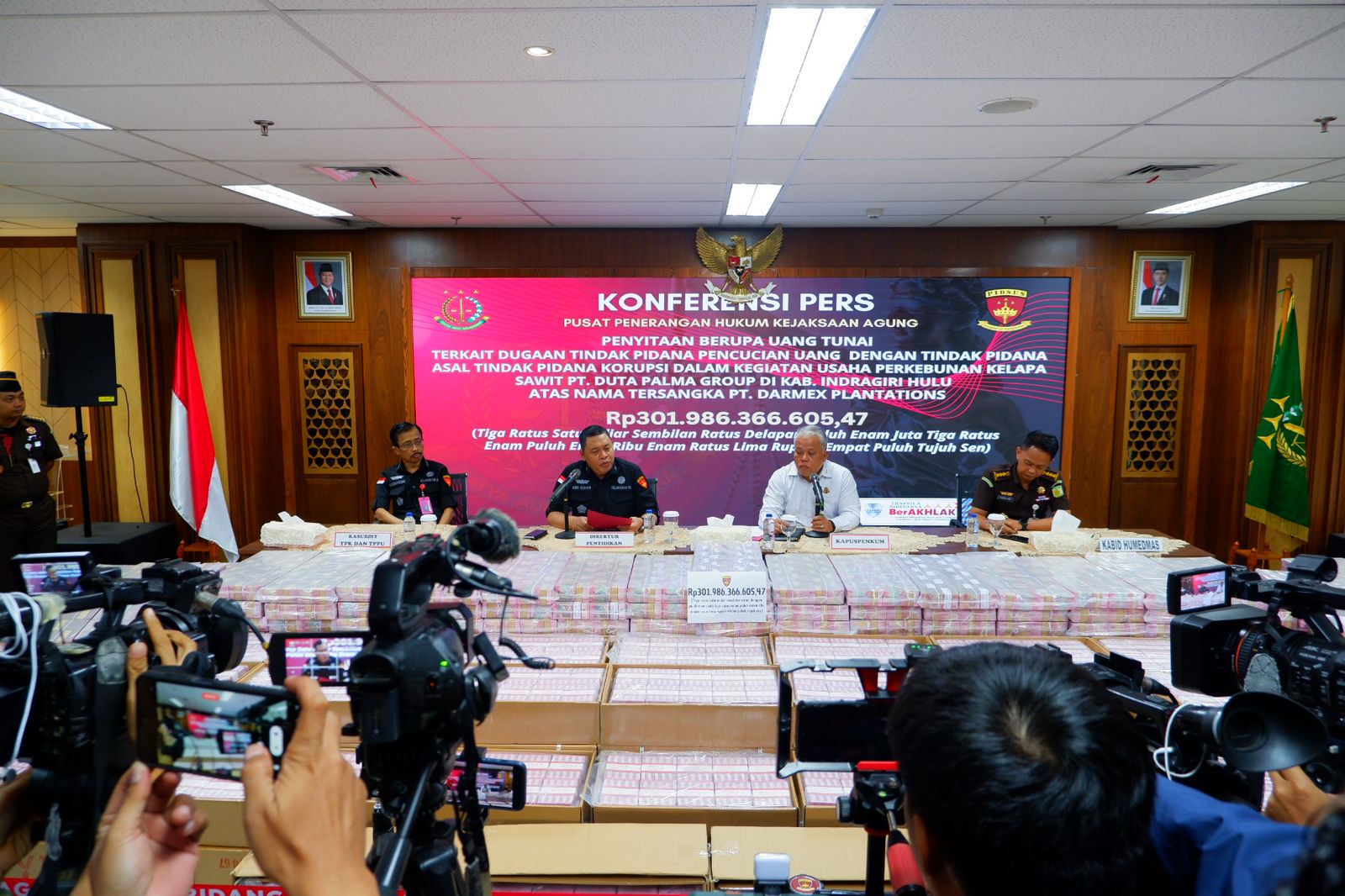 Tim Penyidik pada Direktorat Penyidikan Jaksa Agung Muda Bidang Tindak Pidana Khusus (JAM PIDSUS) telah melakukan penyitaan uang senilai Rp301 miliar pada Selasa 12 November 2024, dalam perkembangan perkara dugaan tindak pidana pencucian uang dengan tindak pidana asal tindak pidana korupsi pada kegiatan usaha perkebunan sawit yang dilakukan oleh PT Duta Palma Group di Kabupaten Indragiri Hulu.