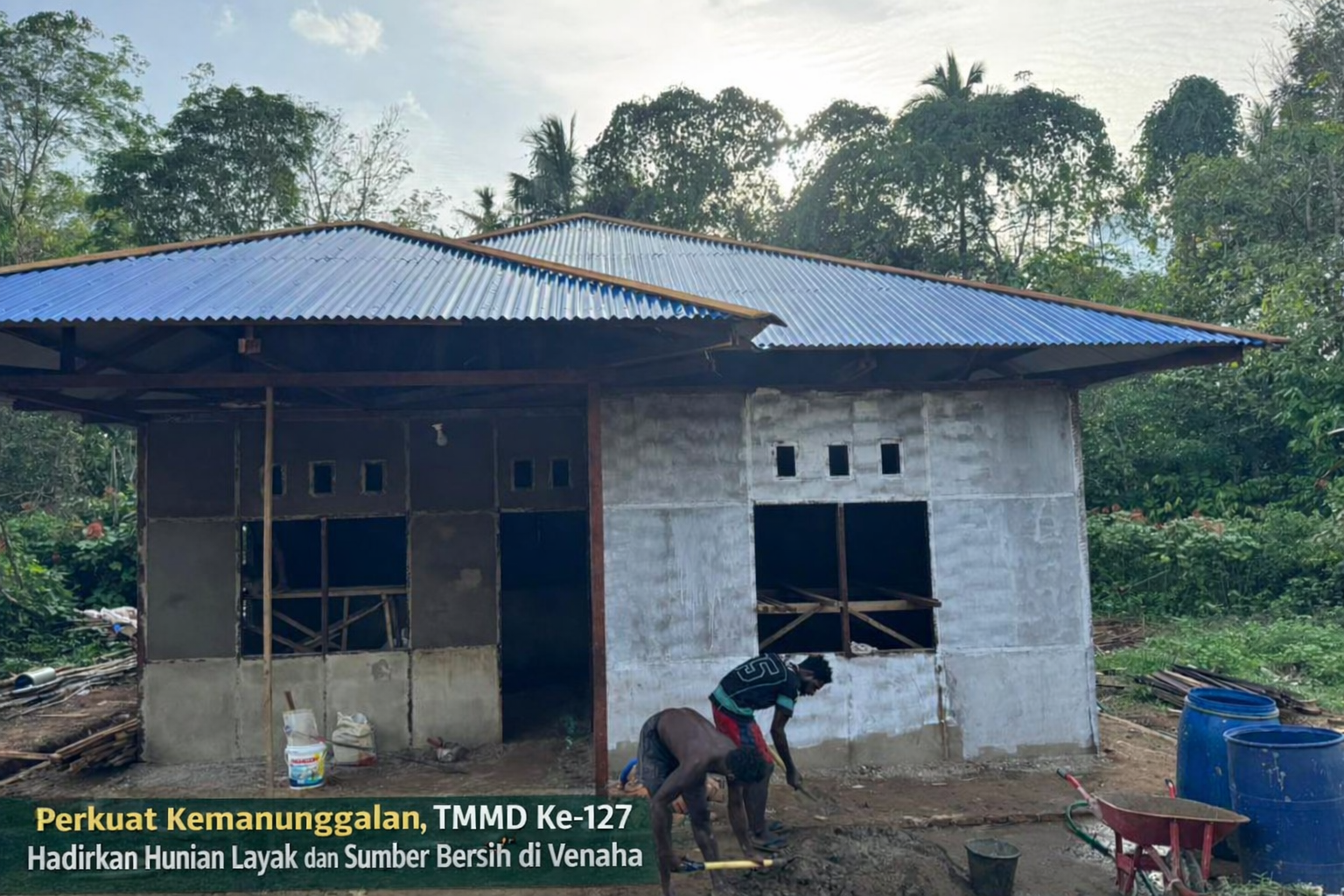 Tak hanya hunian layak, personel Satgas TMMD juga melakukan pemuatan material bangunan dari dermaga menuju lokasi pekerjaan—sebuah tantangan tersendiri mengingat akses distribusi di wilayah tersebut masih mengandalkan jalur sungai.