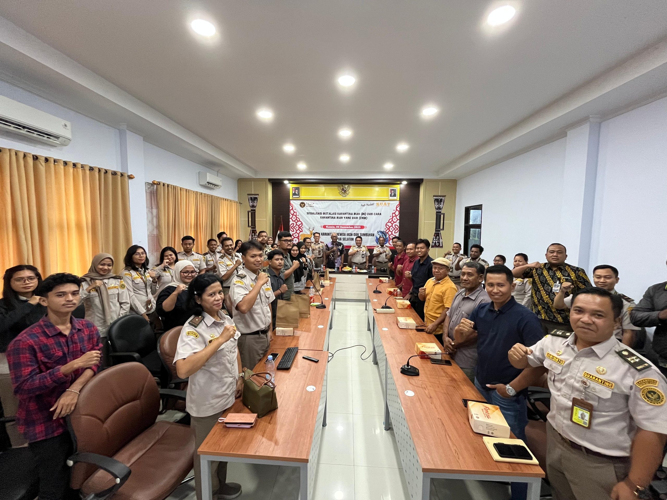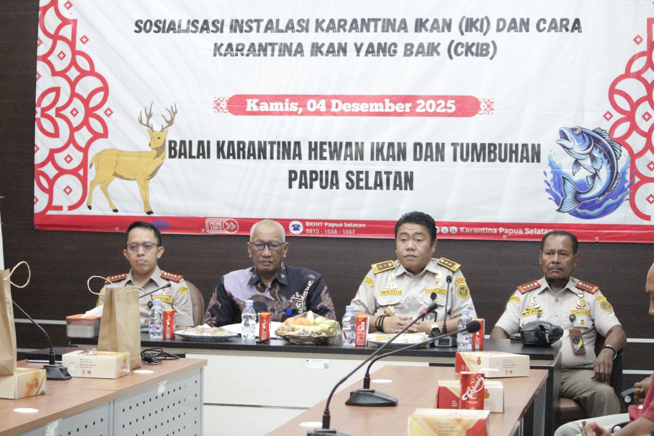 Merauke||Cendrawasi7, Upaya meningkatkan daya saing komoditas perikanan Papua Selatan terus digenjot. Badan Karantina Indonesia (BARANTIN) melalui Balai Karantina Hewan, Ikan, dan Tumbuhan (BKHIT) Papua Selatan menggelar sosialisasi bersama para pelaku usaha perikanan terkait pentingnya Instalasi Karantina Ikan (IKI) sebagai syarat utama pemenuhan standar ekspor. Kegiatan berlangsung pada Kamis (4/12/2025).