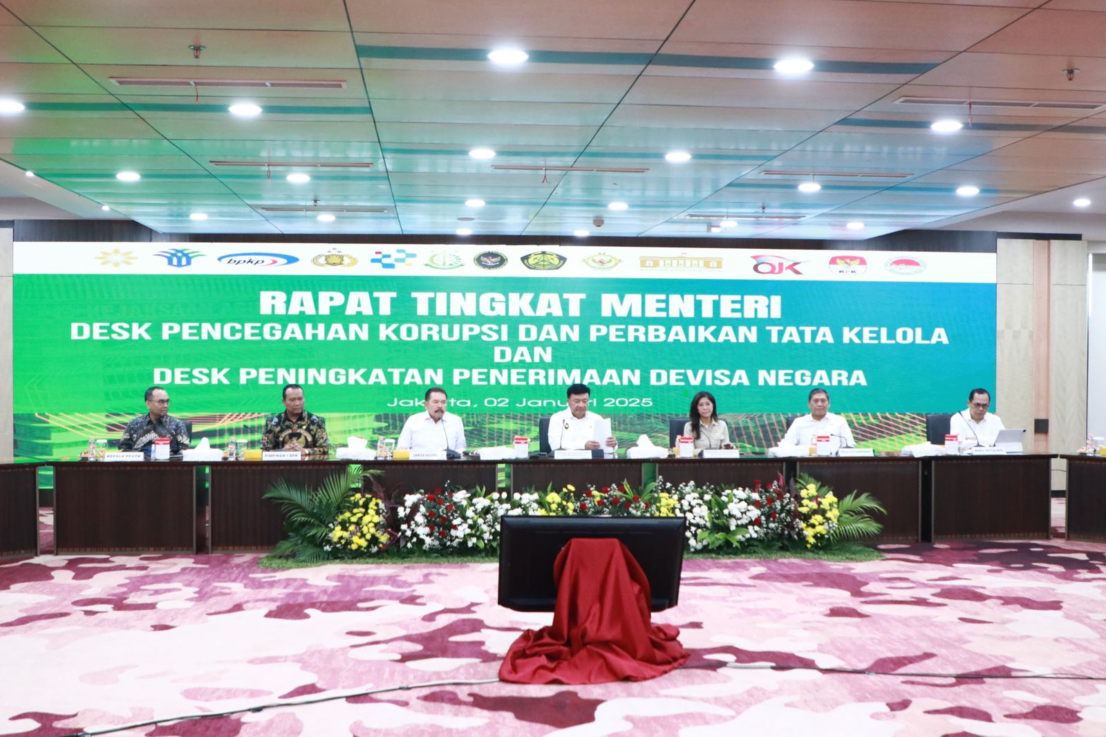 Kamis 2 Januari 2025, Kejaksaan Agung selaku Ketua Desk menyelenggarakan Rapat Tingkat Menteri terkait Desk Koordinasi Pencegahan Korupsi dan Perbaikan Tata Kelola serta Desk Koordinasi Peningkatan Penerimaan Devisa Negara di Gedung Utama Kejaksaan Agung, Jakarta.