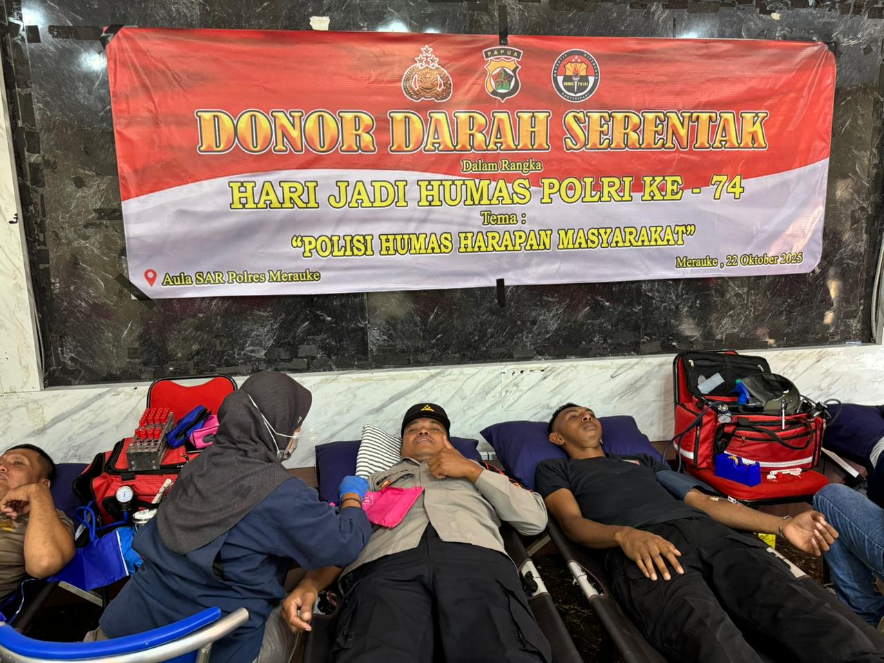 Merauke||Cendrawasi7, Dalam rangka memperingati Hari Jadi Humas Polri ke-74, jajaran Polres Merauke menggelar kegiatan Donor Darah Serentak sebagai wujud nyata kepedulian terhadap sesama. Aksi sosial yang berlangsung di Aula Sarja Arya Racana, Jalan Brawijaya, Merauke, ini diikuti berbagai unsur TNI-Polri dan masyarakat. Rabu (22/10/2025).