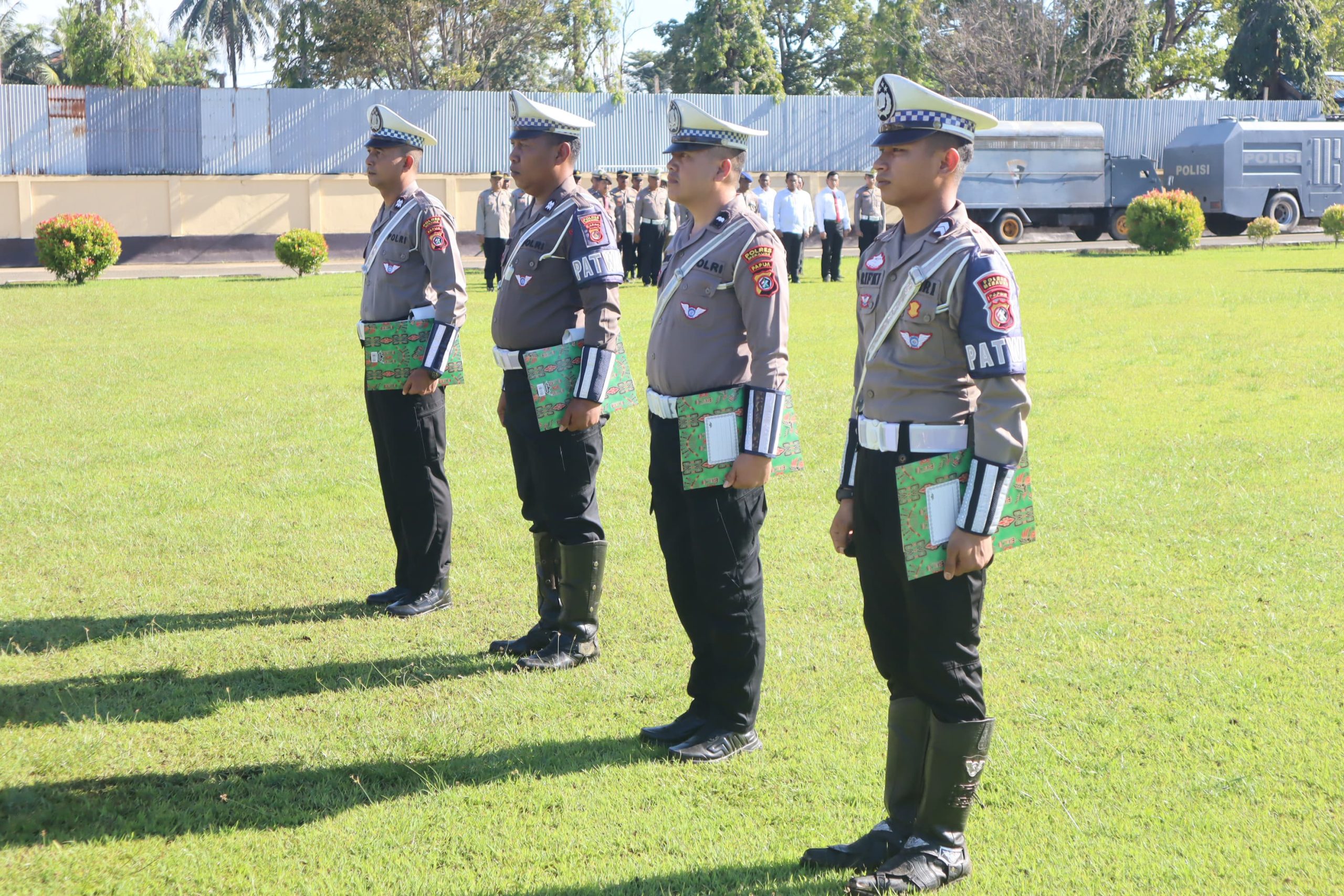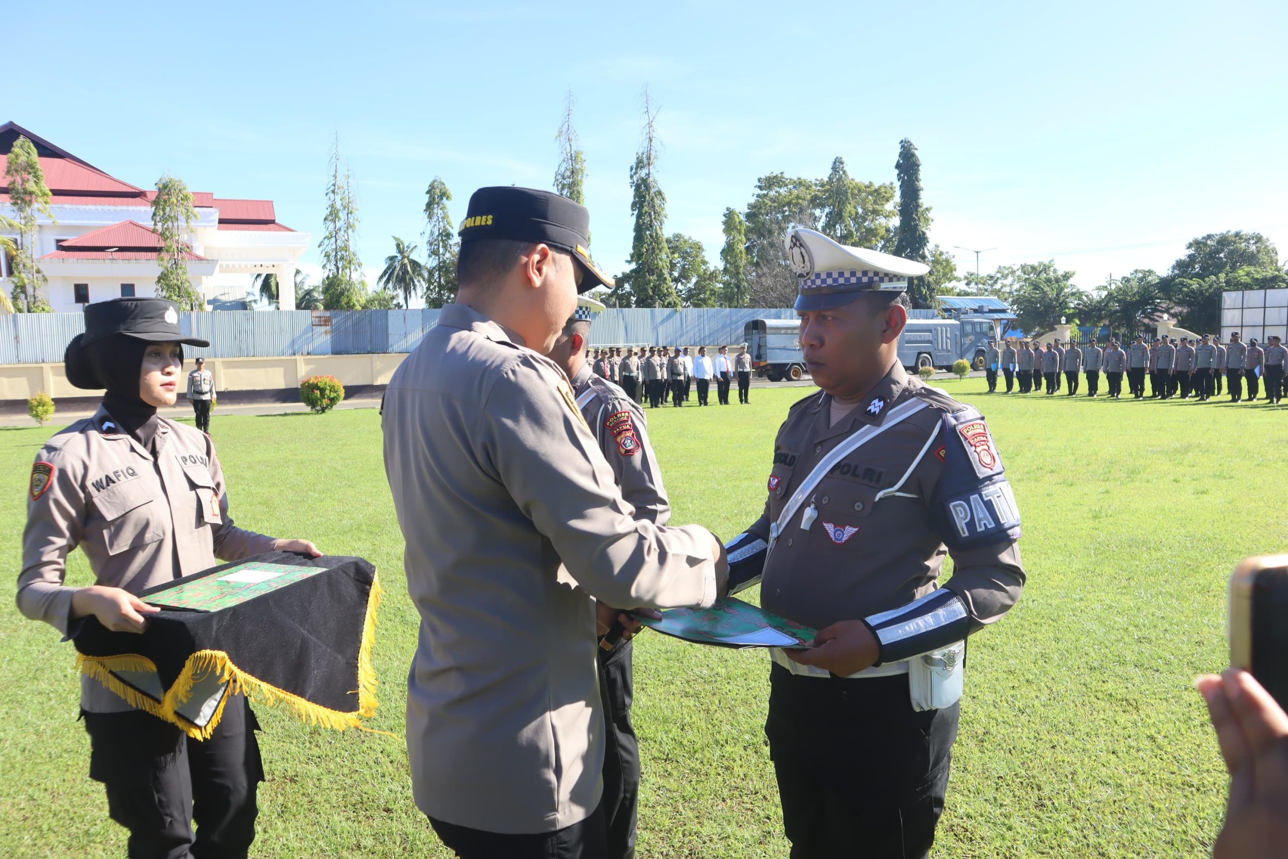 Merauke||Cendrawasi7, Kapolres Merauke AKBP Leonardo Yoga memberikan penghargaan kepada empat anggota Satuan Lalu Lintas (Sat Lantas) Polres Merauke yang dinilai berprestasi dalam pelaksanaan tugas di lapangan. Penyerahan penghargaan digelar di lapangan apel Mapolres Merauke, Senin (30/3/2026).