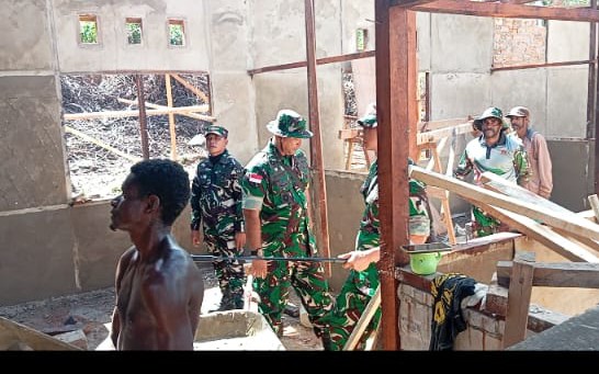 Sementara di Rumah Nomor 3 milik Yohanis Boskow Avu, personel TMMD melakukan pemasangan kordeng dan plester dinding. Tak hanya itu, satgas juga memuat material bangunan dari pinggir dermaga menuju lokasi kerja untuk mempercepat distribusi bahan.
