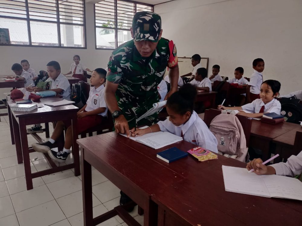 📍 Sorong, Papua Barat Daya, Kepedulian terhadap dunia pendidikan kembali ditunjukkan oleh Babinsa Koramil 1709-01/Serui, Koptu Aan Kurniawan. Kali ini, ia meluangkan waktunya untuk ikut serta dalam kegiatan belajar mengajar di SD Inpres Tingkat Serui, yang berlokasi di Jalan Frans Kaisepo, Distrik Yapen Selatan, Kabupaten Kepulauan Yapen, Senin (27/10/2025).
